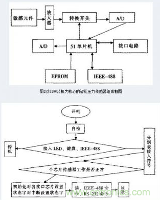 總體結(jié)構(gòu)設(shè)計(jì)。半導(dǎo)體敏元件、放大器、轉(zhuǎn)換開關(guān)、雙積分A/D轉(zhuǎn)換器、單片機(jī)、接口電路、IEEE~488標(biāo)準(zhǔn)接口、存儲(chǔ)器以及部分外圍電路組合在一起形成了智能壓力傳感器。