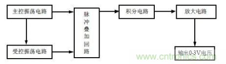 HS1101在電路中相當于一個電容器件,它的電容量隨著所測空氣濕度的增加而增大,為了能將電容的變化轉(zhuǎn)換成電壓的變化,我們設(shè)計了振蕩電路、消除零點電容影響電路、整流電路、積分電路、電壓—電流轉(zhuǎn)換電路、放大電路等,其工作原理簡圖如圖2 所示。