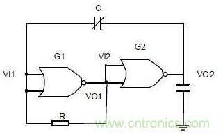 振蕩電路的作用是將電容的變化量轉(zhuǎn)化為頻率可變的方波。由圖3 可知,這是一個非對稱多諧振蕩器。或非門G1 工作在電壓傳輸特性的轉(zhuǎn)折區(qū),把它的輸出電壓直接連接到或非門G2 的輸入端。G2即可得到一個介于高低電平之間的靜態(tài)偏置電壓,從而使G2 的靜態(tài)工作點也處于電壓傳輸特性轉(zhuǎn)折區(qū)上。反饋環(huán)路中電容使電路在兩個暫穩(wěn)態(tài)之間往復(fù)振蕩。