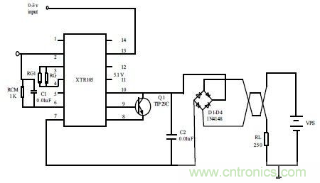 輸出的0~3V 電壓通過XTR105 芯片的2 和13 引腳輸入。調(diào)整3 和4 引腳間的電阻RG和RG1 的值,可以改變XTR105 芯片的內(nèi)置儀表放大器增益值,從而選定合適的測量范圍。RCM 取為1KO,它提供一個附加電壓降,使XTR105 的輸入電壓限制在共模方式下的電壓范圍內(nèi)。與RCM 并聯(lián)的0.01μF 旁路電容用于降低共模噪聲。