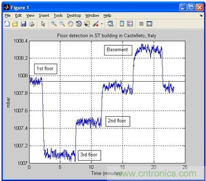 圖2所示是在意法半導(dǎo)體的意大利Castelletto寫(xiě)字樓內(nèi)采集到的壓力傳感器數(shù)據(jù)。采樣速率是7Hz,數(shù)據(jù)采集時(shí)間總計(jì)大約23分鐘。從圖中我們可以清晰地看到大氣壓在不同樓層的變化。大氣壓在地下室最高。隨著樓層升高,大氣壓逐漸降低。