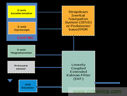 圖4所示是PNS或PDR的結(jié)構(gòu)示意圖。從傳感器角度看,該系統(tǒng)包括一個(gè)3軸加速度計(jì)、一個(gè)3軸陀螺儀、一個(gè)3軸磁力計(jì)和一個(gè)壓力傳感器。此外,在這個(gè)示意圖內(nèi)還有一個(gè)GPS接收器和一個(gè)主處理器。主處理器用于采集傳感器數(shù)據(jù),運(yùn)行航位推測(cè)算法和卡爾曼濾波算法