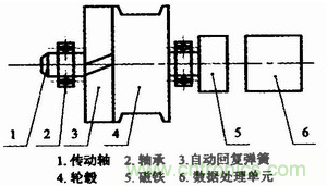 基于磁敏角度技術的拉線式位移傳感器的功能是將拉線的機械位移換成可以計量、記錄或傳送的電信號,主要由自動回復彈簧、輪轂、磁鐵以及數(shù)據(jù)處理單元等部分構成,結構如圖1所示。