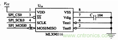 由于串行通信的輸出信號直接來自于MLX90316的內(nèi)部DSP輸出,SPI輸出模式更穩(wěn)定,誤差更小,并且具有更高的抗干擾能力。在本設計中,選用SPI接口,具體的硬件接口連接電路如圖3所示。在圖3中,MLX90316的SPI三根線與ARM LPC2136的SPl0口連接。SPI(SerialProtocol InterIace)總線接口是一種同步串行外設接口。這是一個4根信號線的串行接口協(xié)議,包括主、從兩種模式。這4根信號線分別是:時鐘線(SCK)、數(shù)據(jù)輸入線(MISO)、數(shù)據(jù)輸出線(MOSI)和從設備使能線(SS)。