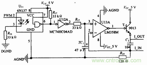 數(shù)據(jù)處理單元具備一路可控4~20 mA的電流輸出,用于現(xiàn)場指示儀表的驅動。具體的連接電路如圖4所示。其中PWM2連接ARM的PWM2引腳,PWM信號用于控制光耦的導通與截止,反相器主要用于波形的整定,根據(jù)磁敏角度和位移關系,建立數(shù)學模型,計算出PWM的占空比,從而達到電流大小調(diào)節(jié)的目的。