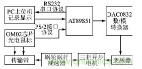 本系統(tǒng)采用全閉環(huán)控制方式,如下圖圖2,將鼠標(biāo)檢測(cè)到位移增量反饋回單片機(jī),并進(jìn)行數(shù)字式PID控制,運(yùn)算結(jié)果通過(guò)D/A轉(zhuǎn)換芯片傳給變頻器,從而控制電機(jī)的轉(zhuǎn)速。