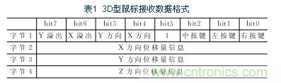 按照鼠標(biāo)的PS/2協(xié)議規(guī)范,實(shí)際編程時(shí)先對(duì)鼠標(biāo)發(fā)送0xff使其復(fù)位,默認(rèn)采樣頻率為100次/秒,縮放比例1:1,數(shù)據(jù)報(bào)告禁止。使用0xea命令進(jìn)入stream模式、使用0xe8,0x03命令設(shè)置解析度為8點(diǎn)/毫米。使用0xf4命令使能數(shù)據(jù)報(bào)告。配合AT89S51單片機(jī)的定時(shí)器功能,將其時(shí)間常數(shù)設(shè)置為0.1s,每次中斷時(shí)發(fā)送0xeb命令讀取位移數(shù)據(jù)信息,每發(fā)出一次,單片機(jī)接收到的位移數(shù)據(jù)包都包含有位移信息和按鍵動(dòng)作信息。具體格式為表1所示。編譯時(shí)也只需提取X3的有效數(shù)據(jù)包即Y方向位移增量