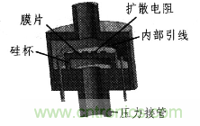 所設計的壓阻式壓力微傳感器,其制法是將N型硅腐蝕成厚10~25μm的膜片,并在一面擴散了4個阻值相等的P型電阻。硅膜片周邊用硅杯固定,則當膜片兩面有壓力差時,膜片即發(fā)生變形,從而導致電阻變化。用微電路檢測出這種電阻變化,通過計算即可得出壓力變化如圖2所示。