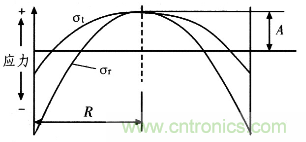 同樣,當r=0.812R時,σT=0,且σr<0,如圖3所示。在圓形硅膜片上,沿[110]晶向,在0.635R半徑內(nèi)外各擴散2個電阻,并適當安排擴散的位置,使得σn=一σro,則有(△R/R)i=一(△R/R)