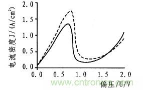 介觀壓阻效應的定義為“等效電阻的應力調(diào)制”,等效電阻是對共振隧效應的一種具體描述。由4個物理過程組成:①在力學信號下,納米結構中的應力分布將發(fā)生變化;②一定條件下應力變化可引起內(nèi)建電場的產(chǎn)生;③內(nèi)建電場將導致納米帶結構中量子能級發(fā)生變化;④量子能級變化會引起共振隧穿電流變化。簡言之,在共振隧穿附近,通過上述過程,可將一個微弱的力學信號轉化。為一個較強的電學信號,體現(xiàn)出較大的壓阻系數(shù)。這里所用的介觀壓阻效應元件為GaAs/A1As/InGaAs DBRT結構薄膜納米級窄帶隙材料。隨著外部壓力引起的拉伸應變的變化(如圖1所示),DBRT結構的共振隧穿電流和阻抗顯著變化。并且,阻抗應變輸出可由外部電壓有效調(diào)節(jié)。其優(yōu)點是靈敏度高、靈敏度可調(diào)、靈敏度隨溫度變化小。