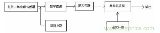 檢測電路由紅外二氧化碳傳感器、數(shù)字濾波電路、放大電路、穩(wěn)流電路、單片機系統(tǒng)、溫度補償?shù)冉M成?;驹硎羌t外二氧化碳傳感器將檢測到的二氧化碳氣體濃度轉(zhuǎn)換成相應的電信號,輸出的電信號分別經(jīng)過濾波、放大處理,輸入到單片機系統(tǒng),并經(jīng)溫度和氣壓補償?shù)忍幚砗螅蓡纹瑱C系統(tǒng)輸出送顯示裝置顯示其測量值。