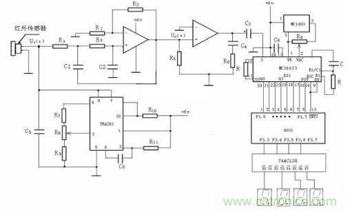 按照上述設計原理,設計的二氧化碳檢測電路如圖3所示。工作原理是首先由紅外傳感器將探測到二氧化碳氣體的濃度并轉(zhuǎn)換成電信號,濾波電路提取電信號并輸出到放大電路,經(jīng)過單片機系統(tǒng)處理后輸出,再由74AC138送入顯示電路,以實現(xiàn)對二氧化碳氣體濃度的檢測。
