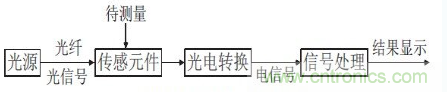 隨著工藝水平的提高,光纖技術(shù)目前相對(duì)成熟。光纖傳感器即為應(yīng)用光纖傳輸?shù)幕驹斫M合的一個(gè)廣電感應(yīng)系統(tǒng)。通常的光纖傳感系統(tǒng)由光源、光導(dǎo)纖維、光傳感元件,光調(diào)制元件和信號(hào)處理部分組成。其工作原理如下圖所示:光源發(fā)出的光經(jīng)過光導(dǎo)纖維進(jìn)入光傳感元件,而在光傳感元件中受到周圍環(huán)境場(chǎng)的影響而發(fā)生變化的光再進(jìn)入光調(diào)制機(jī)構(gòu),由其將傳感元件測(cè)量的參數(shù)調(diào)制成幅度、相位、偏振等信息,這一過程稱為光電轉(zhuǎn)換過程,最后利用微處理器進(jìn)行信號(hào)分析。