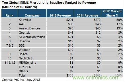 隨著市場的發(fā)展,MEMS麥克風(fēng)市場的格局也在不斷的變化中。在HIS最新的分析報(bào)告顯示,樓氏電子繼續(xù)主宰MEMS麥克風(fēng)市場,2012年以2.9億美元營收傲視所有其它供應(yīng)商,樓氏一家營收已實(shí)際占到整個(gè)MEMS麥克風(fēng)市場的一半。中國AAC和歌爾聲學(xué)排名第二和第四,ST異軍突起,擠進(jìn)前五。