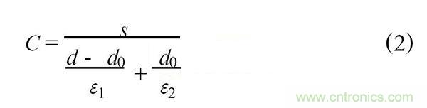 式中,S為極板相互遮蓋面積,單位為m2;d為兩平行板間的距離,單位為m;ε為極板間介質(zhì)的介電常數(shù);εr極板間介質(zhì)的相對介電常數(shù);ε0真空的介電常數(shù)。從上式可以看出,當(dāng)d小時可使電容量增大,而使靈敏度增加,但d過小容易引起電容器擊穿,一般我們可以采取在極板間放置云母來改善,此時電容C為兩電容串聯(lián),可寫成: