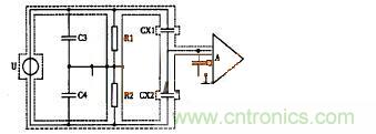 第三個問題是分布電容的影響。由于電容傳感器一個很關(guān)鍵的問題是分布電容電容量與傳感器電容量相比不僅不能忽略,而且影響還極其嚴(yán)重,其后果是造成傳輸效率降低、靈敏度下降、測量誤差增加及穩(wěn)定性變差。近幾年來,對此問題有了新的解決途徑。其中“整體屏蔽法”就是一例,以差動電容傳感器為例,說明整體屏蔽法,在下圖中,CX1、CX2為差動電容,U為電源,A為放大器,整體屏蔽法是把整個電橋(包含電源電纜等)一起屏蔽起來,設(shè)計的關(guān)鍵點在于接地點的合理設(shè)置。采用把接地點放在兩個平衡電阻R1、R2之間與整體屏蔽共地,這樣,傳感器公用極板與屏蔽之間的分布電容C1與放大器的輸入阻抗并聯(lián),從而可把C1視作放大器的輸入電容。由于放大器的輸入阻抗有極大值,C1的并聯(lián)也不希望存在,但它只影響靈敏度而已,另外兩個分布電容C3、C4并聯(lián)在橋臂R1、R2上,會影響電橋的初始平衡和整體靈敏度,并不影響電橋的正常工作。因此,分布參數(shù)對傳感器電容的影響基本消除,整體屏蔽法是解決電容傳感器分布電容問題的很好方法,缺點是使結(jié)構(gòu)復(fù)雜。