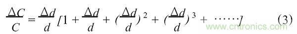 由上式可知變間隙式電容傳感器相對輸出與輸入為非線性關(guān)系。由于Δd/d<<1,工程上常采用以下兩種近似處理方法的辦法: