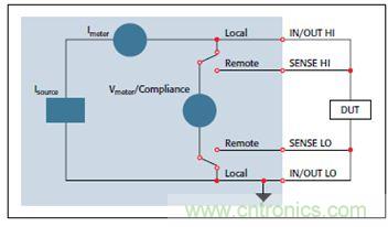 圖2:SMU儀器作為恒流源和伏特計(jì)的配置,用于測量DUT的響應(yīng)