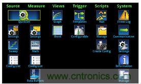 吉時利2450型交互式數(shù)字源表SMU儀器簡化了非傳統(tǒng)用戶的學(xué)習(xí)曲線,使之從使用多層菜單結(jié)構(gòu)和多功能按鈕配置功能的繁瑣工作中解脫出來。2450型儀器使用基于圖標(biāo)的平面菜單系統(tǒng),就像在智能消費(fèi)電子產(chǎn)品中使用的菜單系統(tǒng)一樣簡單,如平板電腦或智能手機(jī)上顯示的應(yīng)用圖標(biāo)排列。