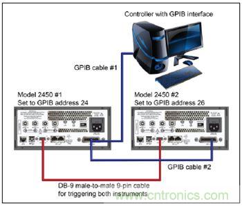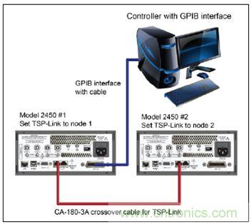 對于計(jì)算機(jī)與2450型儀器的GPIB通信,只需要1根電纜,實(shí)現(xiàn)GPIB接口與2450型儀器IEEE-488接口的連接(圖8中2450型#1)。將2450型#1的TSP-Link節(jié)點(diǎn)設(shè)為節(jié)點(diǎn)1,將2450型#2的TSP-Link節(jié)點(diǎn)設(shè)為節(jié)點(diǎn)2。