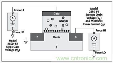 利用兩個2450型數(shù)字源表SMU儀器可以對BioFET進(jìn)行特性分析,從而對傳感器進(jìn)行I-V特性分析。確定BioFET的I-V參數(shù)有助于確保其在預(yù)期應(yīng)用中恰當(dāng)?shù)匕l(fā)揮作用,并滿足性能要求。利用2450型儀器可以進(jìn)行多種I-V測試,包括柵極泄漏、擊穿電壓、閾值電壓、傳輸特性以及漏電流。進(jìn)行測試所需的2450型SMU儀器數(shù)量取決于需要偏置和測量的FET端口數(shù)。