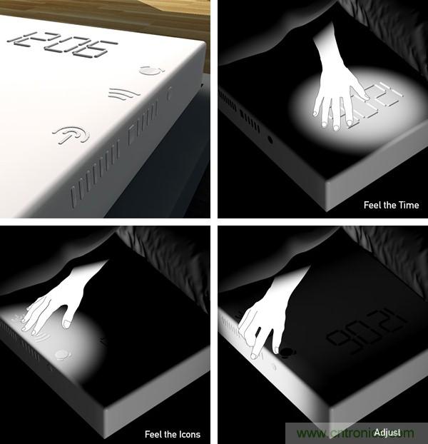 開(kāi)關(guān)、音量調(diào)節(jié)、功能設(shè)置等凸起按鈕,它們都被隱藏在床單下面,不必睜開(kāi)雙眼,通過(guò)觸摸,我們就可以知曉和調(diào)節(jié)時(shí)間。這些模塊是采用一種仿生材料制成的,這種材料又被稱為人工肌肉。它通過(guò)收縮或者膨脹來(lái)改變外形,從而達(dá)到變幻時(shí)間顯示數(shù)字的效果。