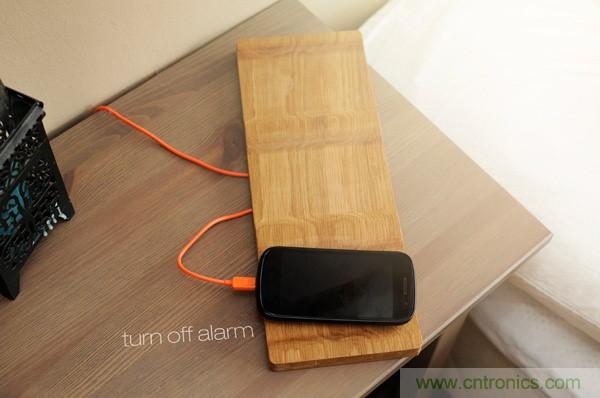 而Tangible Alarm的設(shè)計(jì)Tangible Alarm就像一塊長(zhǎng)條形的木板,可以無(wú)線同步手機(jī)鬧鐘,通過(guò)簡(jiǎn)單的移動(dòng)手機(jī),完成各種鬧鐘狀態(tài)的操作。Tangible Alarm共有三個(gè)移動(dòng)的位置,包括小睡移動(dòng)到右側(cè)、關(guān)閉移動(dòng)到左側(cè)以及中間即是當(dāng)前鬧鐘設(shè)置狀態(tài)。