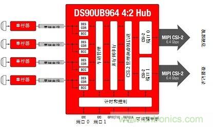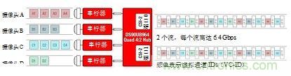 圖3所示為四攝像頭系統(tǒng),具有由彩色塊所示的不同數(shù)據(jù)速率。聚合數(shù)據(jù)在移動工業(yè)處理器接口(MIPI)攝像頭串行接口(CSI)-2端口0和1兩者處呈現(xiàn)。CSI-2總線具有“突發(fā)性”,意味著其以固定數(shù)據(jù)速率運行、將發(fā)送數(shù)據(jù)為可用狀態(tài),并且當機器空閑時恢復(fù)到低功率(LP)狀態(tài)。因此,傳感器速度可在不改變ECU處理器時序的條件下進行變化。即使傳感器鏈路以獨立頻率運行,解串器集線器在單個參考時鐘上也可將數(shù)據(jù)提供給片上系統(tǒng)(SoC)處理器,從而簡化系統(tǒng)時序。