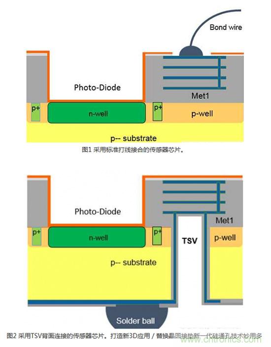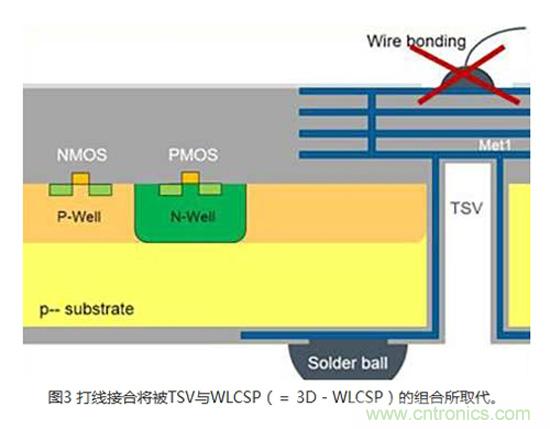 模擬3DIC技術(shù)通常是透過(guò)建造芯片正面到IC背面的電氣連接來(lái)實(shí)現(xiàn)傳感器應(yīng)用。 在許多傳感器應(yīng)用,例如光學(xué)、化學(xué)、氣體或壓力傳感器中,感測(cè)區(qū)域是位在CMOS側(cè)(晶圓的頂端)。 芯片和導(dǎo)線架之間最常用的連接是打線接合(Wire bonding)(圖1)。 無(wú)論是使用塑料封裝,或是將裸片直接接合在印刷電路(PCB)或軟性電路板上,對(duì)于某些會(huì)將感測(cè)區(qū)域暴露出來(lái)的應(yīng)用而言,打線接合并非理想的解決方案。 采用專(zhuān)業(yè)晶圓代工業(yè)者的專(zhuān)有TSV技術(shù),可以利用TSV、背面RDL和芯片級(jí)封裝(WLCSP)(圖2)來(lái)替代打線。