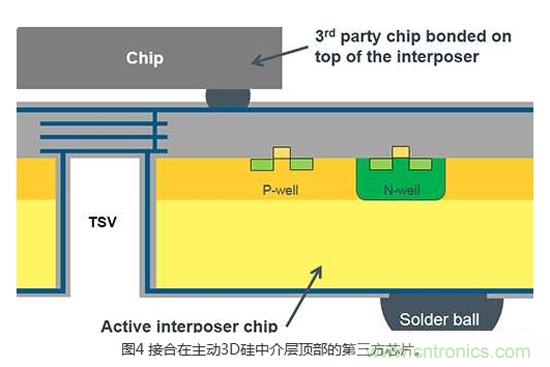 3DIC技術(shù)的另一個(gè)變化和極為創(chuàng)新的發(fā)展,是硅中介層架構(gòu)(Silicon interposer architecture)。 所謂的被動(dòng)3D硅中介層是用來(lái)產(chǎn)生一個(gè)從芯片的頂端到底部的簡(jiǎn)單電氣連接。 所謂的主動(dòng)3D硅中介層能支持實(shí)現(xiàn)完整CMOS設(shè)計(jì)所需制程技術(shù)的所有被動(dòng)和主動(dòng)組件。