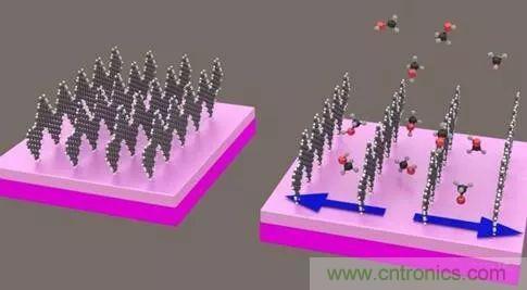 這張圖片呈現(xiàn)了氣體分子如何擴(kuò)大團(tuán)隊(duì)石墨烯納米帶行與行之間的間隙。內(nèi)布拉斯加州材料與納米科學(xué)中心的AlexanderSinitskii及其同事已經(jīng)提出這種現(xiàn)象部分地解釋了納米帶如何為傳感器提供前所未有的靈敏度Sinitskii和他的同事懷疑納米帶的顯著性能部分來源于納米帶和氣體分子之間非同尋常的相互作用。不同于他們的前輩,該團(tuán)隊(duì)的納米帶排列整齊,類似于查理布朗的條紋襯衫般垂直放置,而不是平躺在表面。該團(tuán)隊(duì)指出,氣體分子可以將這些行列分開,有效地延長了納米帶之間的間隙,幫助電子跳躍到導(dǎo)電區(qū)。加入(苯)環(huán)
