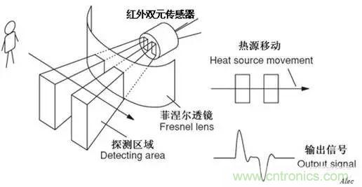 一旦入侵人進(jìn)入探測(cè)區(qū)域內(nèi),人體紅外輻射通過部分鏡而聚焦,從而被熱釋電元接收,但是兩片熱釋電元接收到的熱量不同,熱釋電也不同,不能抵消,經(jīng)信號(hào)處理而報(bào)警。