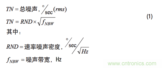 傳感器固有噪聲代表的是陀螺儀在靜態(tài)慣性和環(huán)境條件下運(yùn)行時(shí)其輸出中的隨機(jī)振動(dòng)。MEMS IMU數(shù)據(jù)手冊通常會(huì)提供速率噪聲密度(RND)參數(shù)來描述陀螺儀相對于頻率的固有噪聲。此參數(shù)通常使用單位°/s/√Hz,是預(yù)測特定