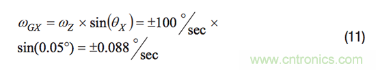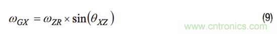 每個(gè)陀螺儀的對齊誤差均具有兩個(gè)分量,分別定義其相對于慣性參考系中另一個(gè)軸的對齊誤差。例如,對于圖2中的系統(tǒng),θXZ代表x軸陀螺儀相對于z軸的對齊誤差。此對齊誤差定義有助于建立公式以計(jì)算離軸陀螺儀對系統(tǒng)慣性參考系中圍繞另一個(gè)軸旋轉(zhuǎn)運(yùn)動(dòng)的響應(yīng)。公式9中給出了一個(gè)示例,其量化了x軸陀螺儀相對于z軸的對齊誤差(θXZ)和圍繞z軸旋轉(zhuǎn)(ωZR)而產(chǎn)生的響應(yīng)(ωGX)。