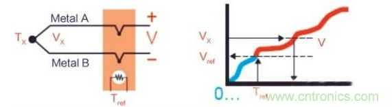 熱電偶是溫度測量中最常用的傳感器。其主要好處是寬溫度范圍和適應(yīng)各種大氣環(huán)境,而且結(jié)實(shí)、價(jià)低,無需供電,尤其最便宜。熱電偶由在一端連接的兩條不同金屬線(金屬A和金屬B)構(gòu)成,如圖1所示。當(dāng)熱電偶一端受熱時,熱電偶電路中就有電勢差??捎脺y量的電勢差來計(jì)算溫度。
