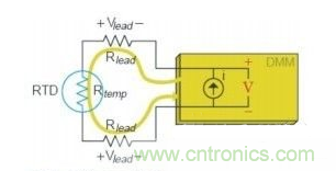 與熱敏電阻相似,鉑電阻溫度傳感器(RTD)也是用鉑制成的熱敏感電阻。當(dāng)通過測量電壓計(jì)算RTD 溫度時,數(shù)字萬用表用已知電流源測量該電流源所產(chǎn)生的電壓。這一電壓為兩條引線(Vlead)上的壓降加RTD上的電壓(Vtemp)。例如,常用RTD 的電阻為100Ω,每1℃僅產(chǎn)生0.385Ω的電阻變化。如果每條引線有10Ω電阻,就將造成26℃的測量誤差,這是不可接受的。所以應(yīng)對RTD作4線歐姆測量。