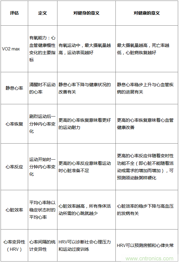 【導(dǎo)讀】在日益數(shù)字化的世界中,光學(xué)心率傳感器在可穿戴設(shè)備中的應(yīng)用越來越廣泛。這些設(shè)備中數(shù)不清的應(yīng)用可提供從個(gè)人活動(dòng)、健身水平到健康狀況的所有內(nèi)容。精準(zhǔn)的生物識(shí)別傳感器數(shù)據(jù)可以提供準(zhǔn)確的健身/健康評(píng)估,但設(shè)計(jì)師和工程師究竟能用這些評(píng)估做些什么呢?表1總結(jié)了目前在健身應(yīng)用中使用的一些常見評(píng)估,這些評(píng)估也證明了健康醫(yī)療的意義。