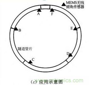 無(wú)線傾角傳感器采用電池供電,將MEMS無(wú)線傾角傳感器安裝在盾構(gòu)隧道內(nèi)襯砌圓環(huán)的管片上,包括封頂塊、鄰接塊、標(biāo)準(zhǔn)塊、封底塊和塊與塊間以環(huán)向螺連接構(gòu)成的縱向接頭等不同部位;實(shí)時(shí)測(cè)量隧道管片內(nèi)各部位的傾斜角度,通過(guò)組合計(jì)算得出管片的實(shí)際形變,實(shí)現(xiàn)對(duì)隧道結(jié)構(gòu)變化準(zhǔn)確、有效地實(shí)時(shí)監(jiān)測(cè),應(yīng)用示意如圖(c)所示。