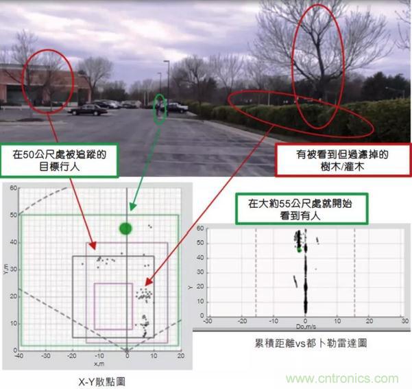 圖1顯示了在一項(xiàng)安防應(yīng)用中,使用芯片上智能算法在50公尺室外入侵探測(cè)器的一項(xiàng)實(shí)驗(yàn)結(jié)果。入侵探測(cè)器用于確定是否有人進(jìn)入受保護(hù)區(qū)域,例如貨運(yùn)場(chǎng)、停車場(chǎng)或后院。一些仰賴光學(xué)或紅外線感測(cè)的探測(cè)器,可能會(huì)檢測(cè)到附近樹木和灌木的錯(cuò)誤運(yùn)動(dòng)。而毫米波傳感器使用處理和算法來(lái)濾除和防止錯(cuò)誤的檢測(cè),僅在人體運(yùn)動(dòng)時(shí)觸發(fā)探測(cè)器。安防攝影機(jī)和可視門鈴(video doorbells)可以通過(guò)聯(lián)網(wǎng)服務(wù)器處理圖像信息,執(zhí)行相同的錯(cuò)誤檢測(cè)過(guò)濾;但這些基于服務(wù)器的系統(tǒng)所提供的功能通常需要使用者付費(fèi),毫米波技術(shù)則可實(shí)現(xiàn)在傳感器本身進(jìn)行決策,無(wú)需聯(lián)網(wǎng)服務(wù)器。