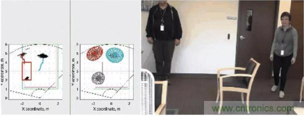 圖4:使用毫米波傳感器執(zhí)行分類的范例:中間圖上所有移動(dòng)目標(biāo)都分配了一個(gè)軌道,其中的每個(gè)彩色區(qū)域代表一個(gè)人