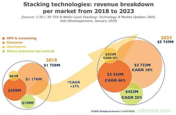 消費類市場(主要是CIS應用),是2018年堆疊封裝營收的最大貢獻者,占據了65%以上的市場份額。盡管如此,高性能計算(HPC)是推動3D封裝技術創(chuàng)新的主要應用,到2023年期間,該應用增長速度最快,市場份額預計將從2018年的20%增長到2023年的40%。