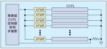 CCFL已在筆記型電腦、數(shù)位相機(jī)、導(dǎo)航系統(tǒng)以及其他具有較小LCD螢?zāi)坏脑O(shè)備中使用多年。這些類型的設(shè)備通常只用一個(gè)CCFL,因此,傳統(tǒng)設(shè)計(jì)只用一個(gè)CCFL控制器。隨著大尺寸LCD面板的出現(xiàn),帶來對(duì)多CCFL的需求,有必要采用新的方式來應(yīng)對(duì)這種新的需求??赡艿姆绞街皇遣捎靡粋€(gè)單通道CCFL控制器來驅(qū)動(dòng)多個(gè)燈(圖5)。這種方式中,CCFL控制器只透過其中的一個(gè)燈來監(jiān)測(cè)燈電流,而以幾乎相同的交流波形同時(shí)驅(qū)動(dòng)所有并聯(lián)的燈。然而,這種方式存在著幾個(gè)缺陷。