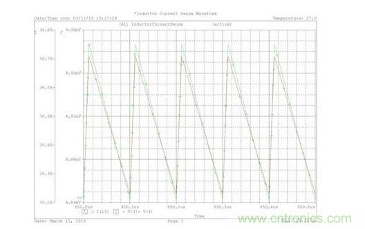 圖3波形是通過(guò)簡(jiǎn)單的 PSPICE 仿真繪制的。說(shuō)明: 曲線自 950 uSec 開(kāi)始,允許諧振 LC(其中 C 是指大容量輸出電容)網(wǎng)絡(luò)達(dá)到接近穩(wěn)態(tài)。還請(qǐng)注意用于覆蓋波形的 Y 軸比例。