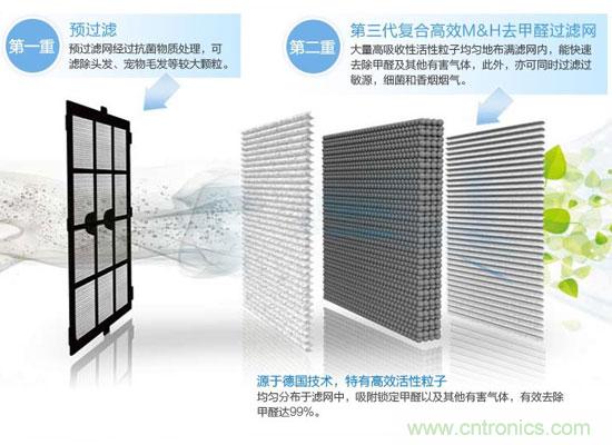 產(chǎn)品第一層預(yù)過濾網(wǎng)主要用于過濾毛發(fā)等較大顆粒。接著,空氣會(huì)進(jìn)行第二層過濾,為第三代M&H高效去甲醛過濾網(wǎng),其特含的高效活性離子層,能分解鎖定甲醛等污染物,去除率最高達(dá)99%,充分有效凈化室內(nèi)空氣污染,對(duì)家人身體健康進(jìn)行保護(hù)。