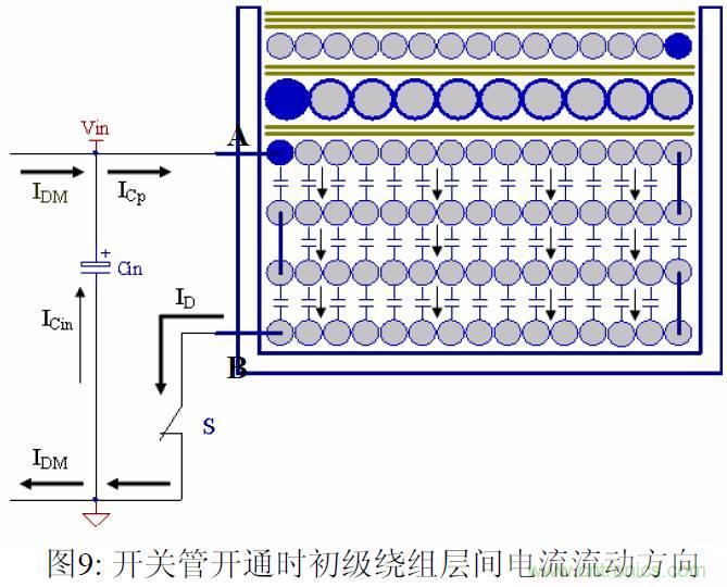 對于常規(guī)的四層初級繞組結(jié)構(gòu),在開關(guān)管開通和關(guān)斷的過程中,層間的電流向同一個方向流動。在圖9中,在開關(guān)管開通時,源極接到初級的地,B點(diǎn)電壓為0,A點(diǎn)電壓為Vin,基于電壓的變化方向,初級繞組層間電容中電流流動方向向下,累積形成的差模電流值大。