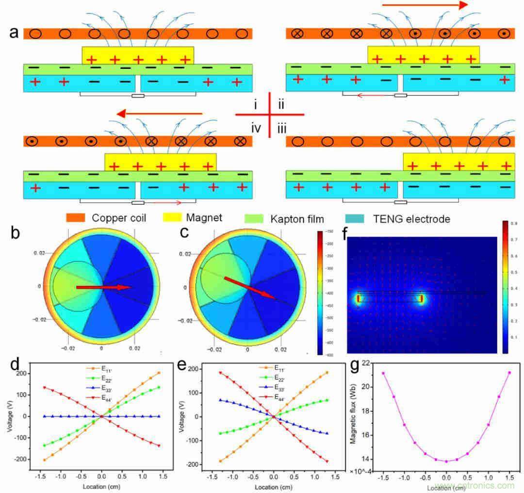 (d-g) 四個(gè)摩擦發(fā)電機(jī)在器件沿四個(gè)方向振動(dòng)時(shí)的輸出對(duì)比;