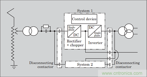 圖6:此處顯示了具有三級脈寬調(diào)制(PWM)轉(zhuǎn)換器和變壓變頻(VVVF)控制系統(tǒng)逆變器架構(gòu)的交流設(shè)計(jì)。該設(shè)計(jì)采用單個(gè)3級VVVF逆變器,共同驅(qū)動并聯(lián)的四臺牽引電機(jī)。(圖片由富士電機(jī)提供)