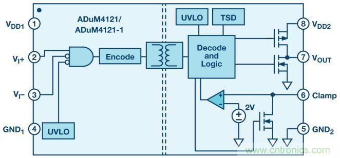 對于更緊湊的純 SiC/GaN 應(yīng)用,新型隔離式柵極驅(qū)動器 ADuM4121是解決方案。該驅(qū)動器同樣基于 ADI 公司的 iCoupler 數(shù)字隔離技術(shù),其傳播延遲在同類器件中最低 (38 ns),支持最高開關(guān)頻率和150 kV/μs 的最高共模瞬變抗擾度。ADuM4121 提供 5 kV rms 隔離,采用寬體 8 引腳 SOIC 封裝。