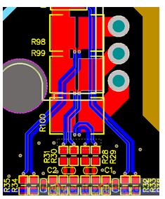 為了能夠準確的采樣電流,應將運放芯片在PCB上的位置盡量靠近采樣電阻,同時又要使運放芯片不能遠離MCU,運放的地和MCU的地應該盡量靠攏。如圖3所示,采樣電阻(R98、R99、R100)兩端走差分線到運放的同相和反相端口,差分線應等距并且盡量短,以避免其他的干擾產生。壓縮機涉及到高壓和低壓部分,在布局電流地的時候,應使大電流地和小電流地能很好的單點隔離。