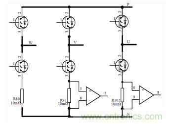 對于320V供電空調壓縮機,電機內阻0.2Ω,如果采樣電阻合適,則對回路沒有什么影響。如果采樣電阻的阻值過大,會引起電壓的損耗,使能量效率變低,較大的阻值會使負載電壓發(fā)生偏移,產生電磁干擾,產生系統(tǒng)對噪聲敏感的問題。當確定好阻值后還需要考慮電阻的穩(wěn)定性能和阻值誤差。